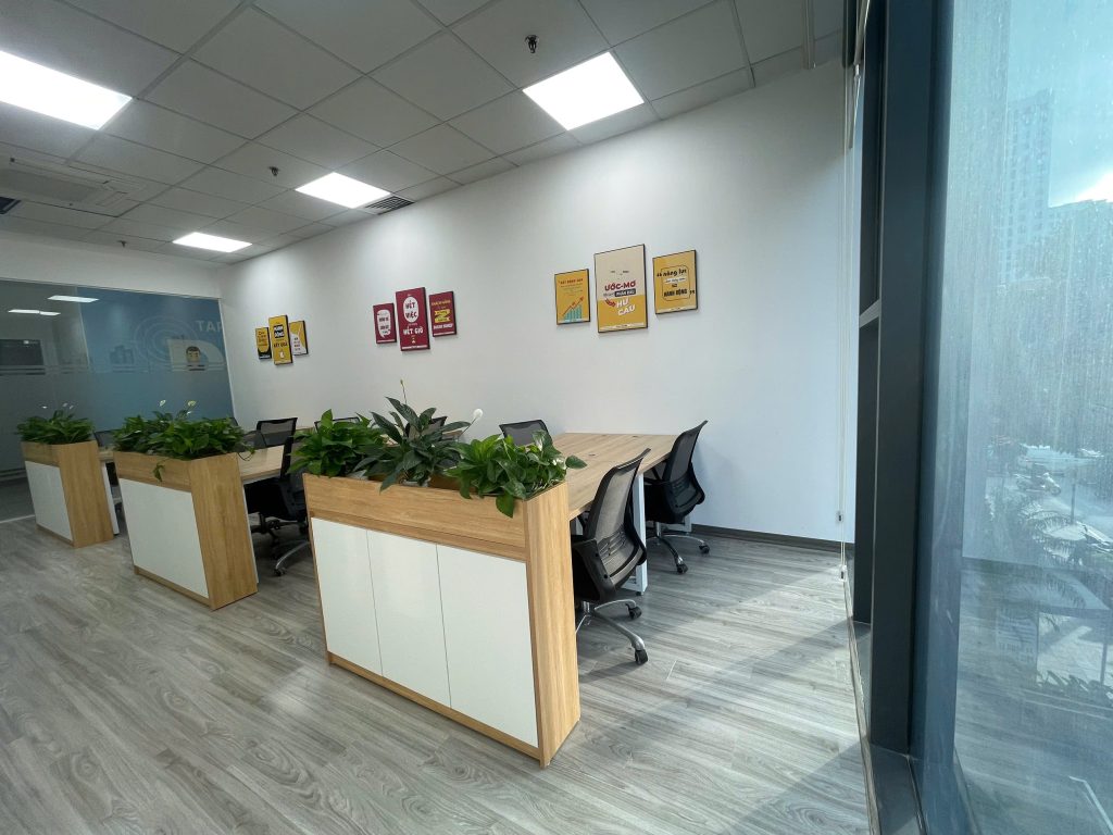 Chỗ ngồi làm việc linh hoạt, máy in – photocopy – máy chiếu đầy đủ. Quyền treo bảng tên và logo công ty riêng, khẳng định thương hiệu.